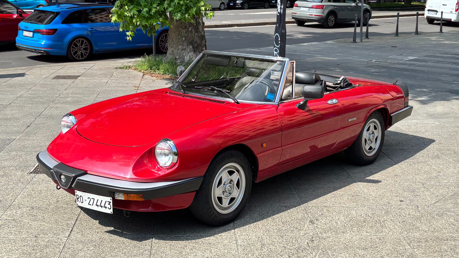 Experience timeless elegance with the red Alfa Romeo Duetto: black interior, leather soft top, and iconic curves for a unique...