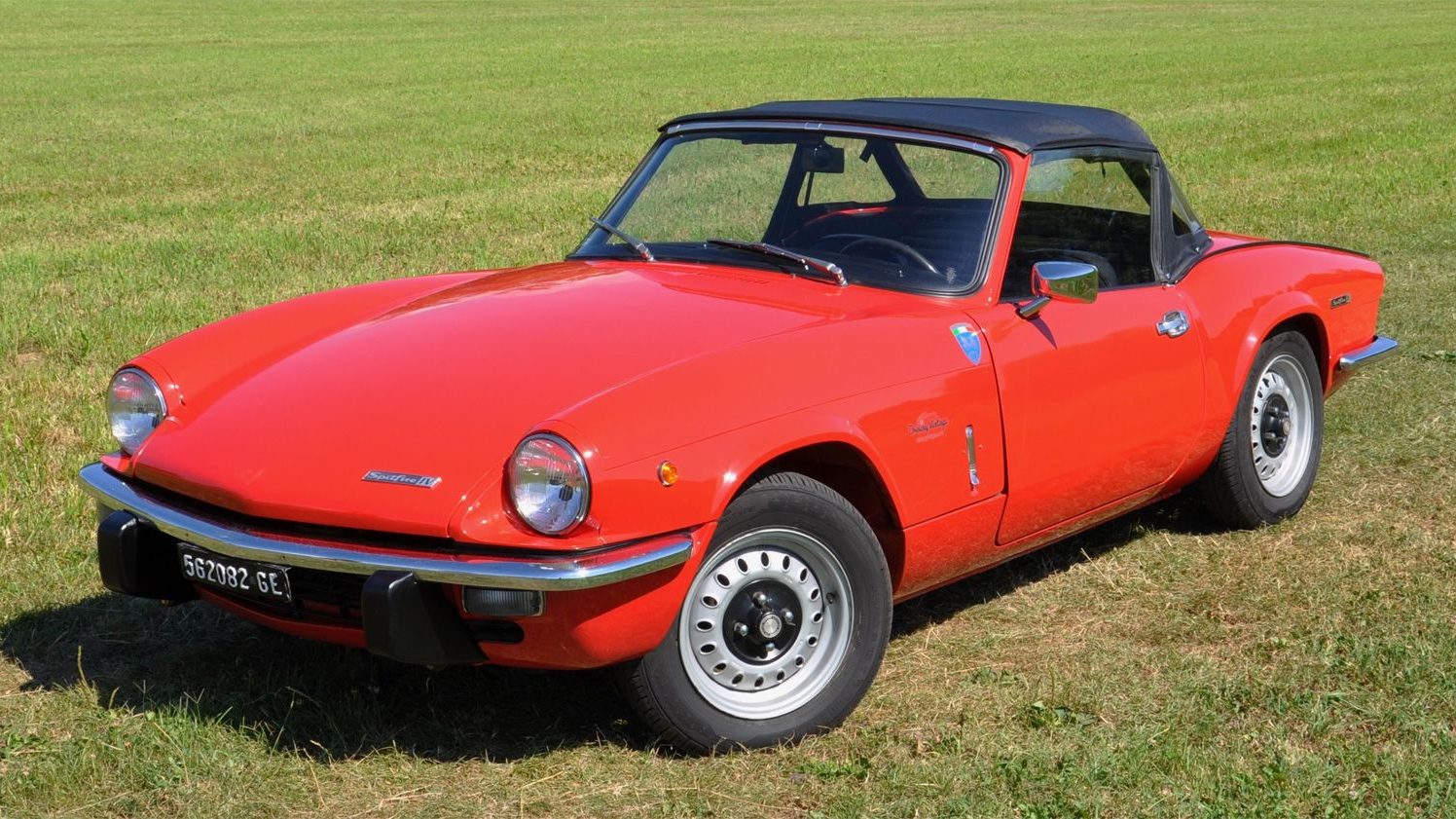 British elegance on wheels: red Triumph Spitfire with black interior. A vintage icon for tours and weddings.