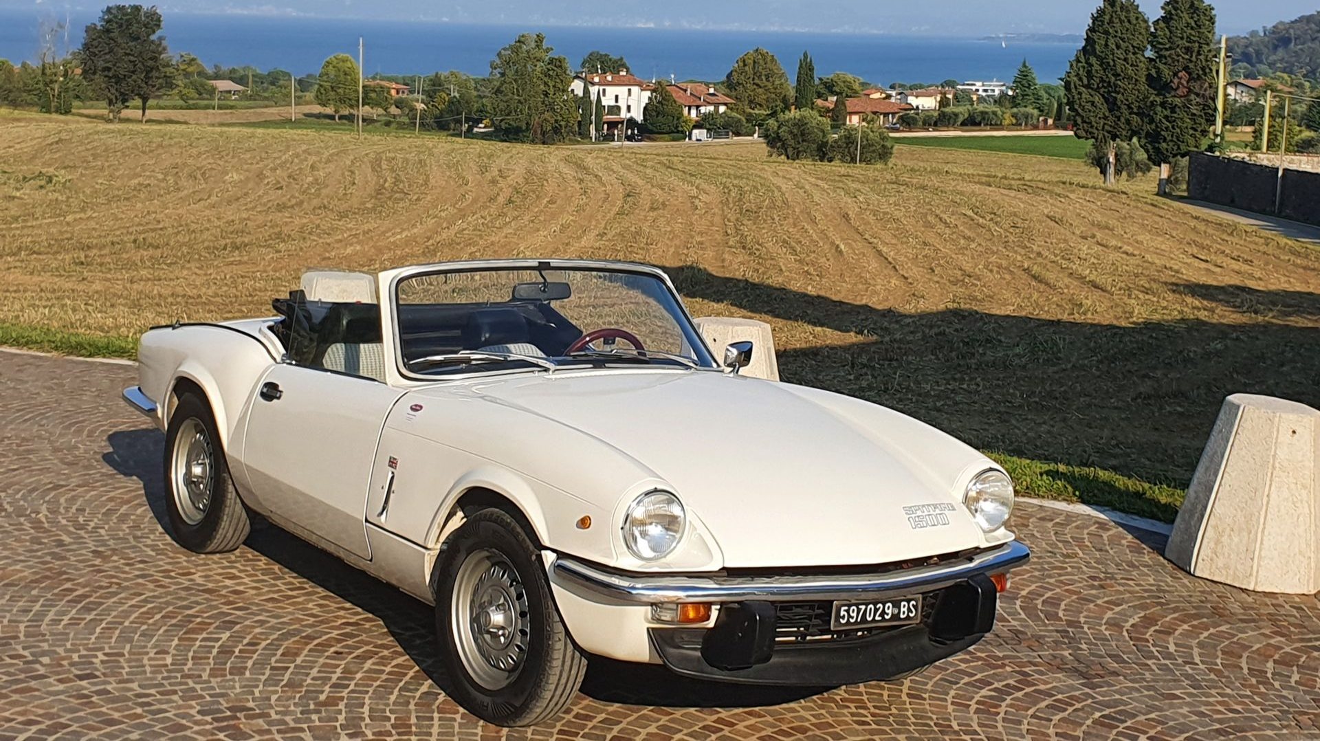 British elegance on wheels: white Triumph Spitfire with black interior. A vintage icon for tours and weddings.