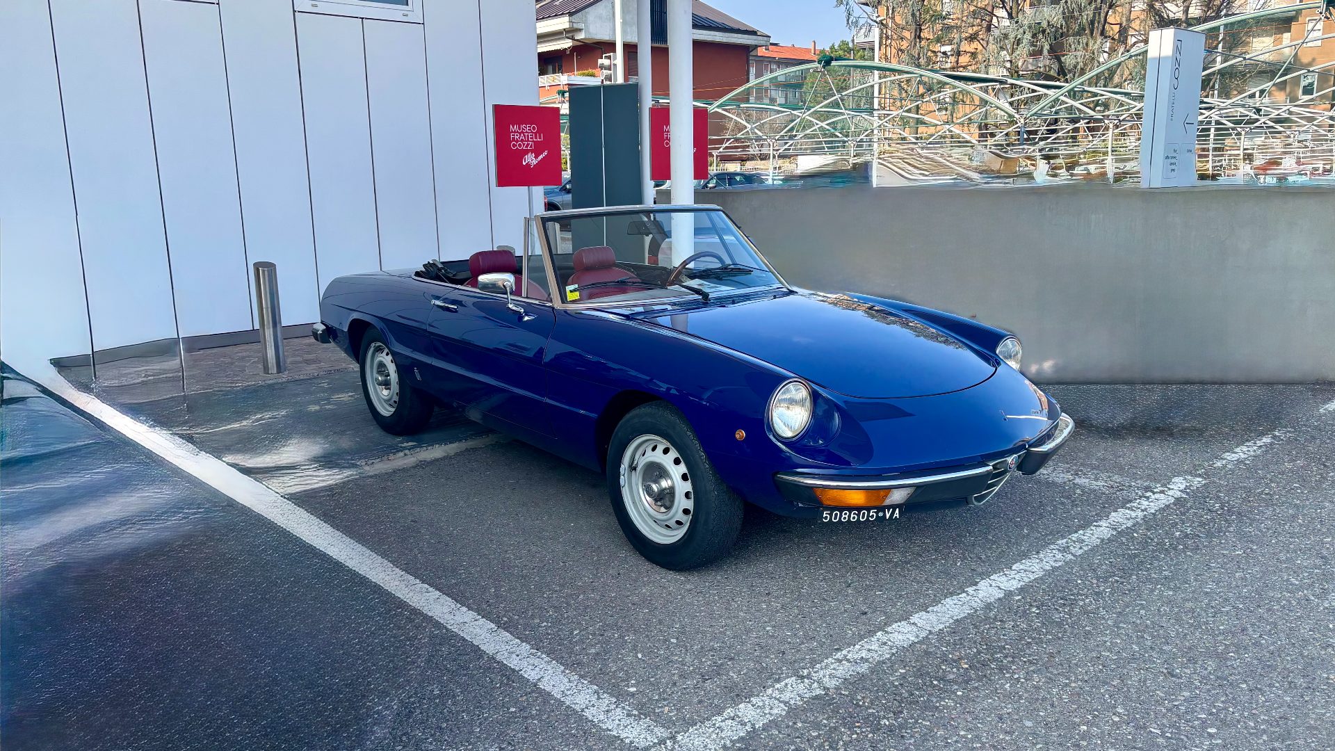 Experience timeless elegance with the blue Alfa Romeo Duetto: red interior, leather soft top, and iconic curves for a unique...