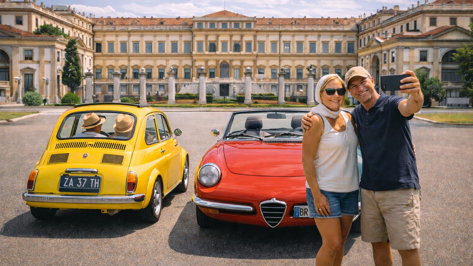 Book a vintage car tour in Lombardy and enjoy a premium Dolce Vita classic car experience starting from Milan. Our curated day trips include iconic routes to Como and Bellagio on Lake Como, plus elegant cultural drives to Villa Reale di Monza and Certosa di Pavia. The perfect choice for travelers looking for an exclusive classic car day trip, scenic tour, and cinematic photo moments across Northern Italy.